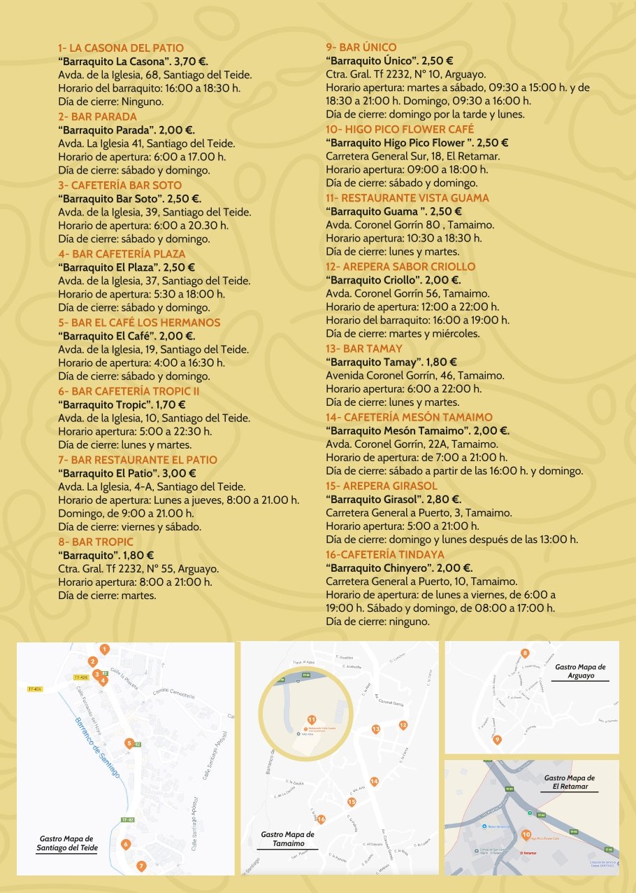 The following establishments are participating in this year's Barraquito Route: Bar Restaurante El Patio, Bar Cafetería Tropic II, Bar El Café Los Hermanos, Bar Cafetería Plaza, Cafetería Bar Soto, Hotel La Casona del Patio, Bar Único, Higo Pico Flower Café, Bar Tamay, Bar Arepera Girasol, Cafetería Tindaya, Bar Cafetería Mesón Tamaimo, Bar Parada, Bar Tropic, Restaurante Vista Guama, and Arepera Sabor Criollo.