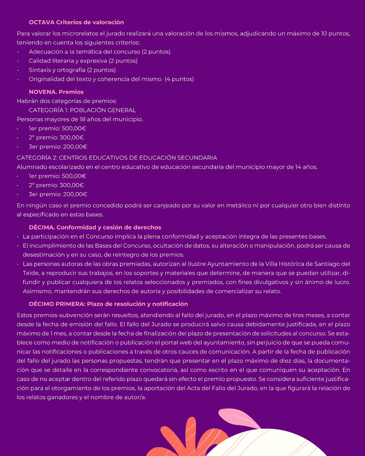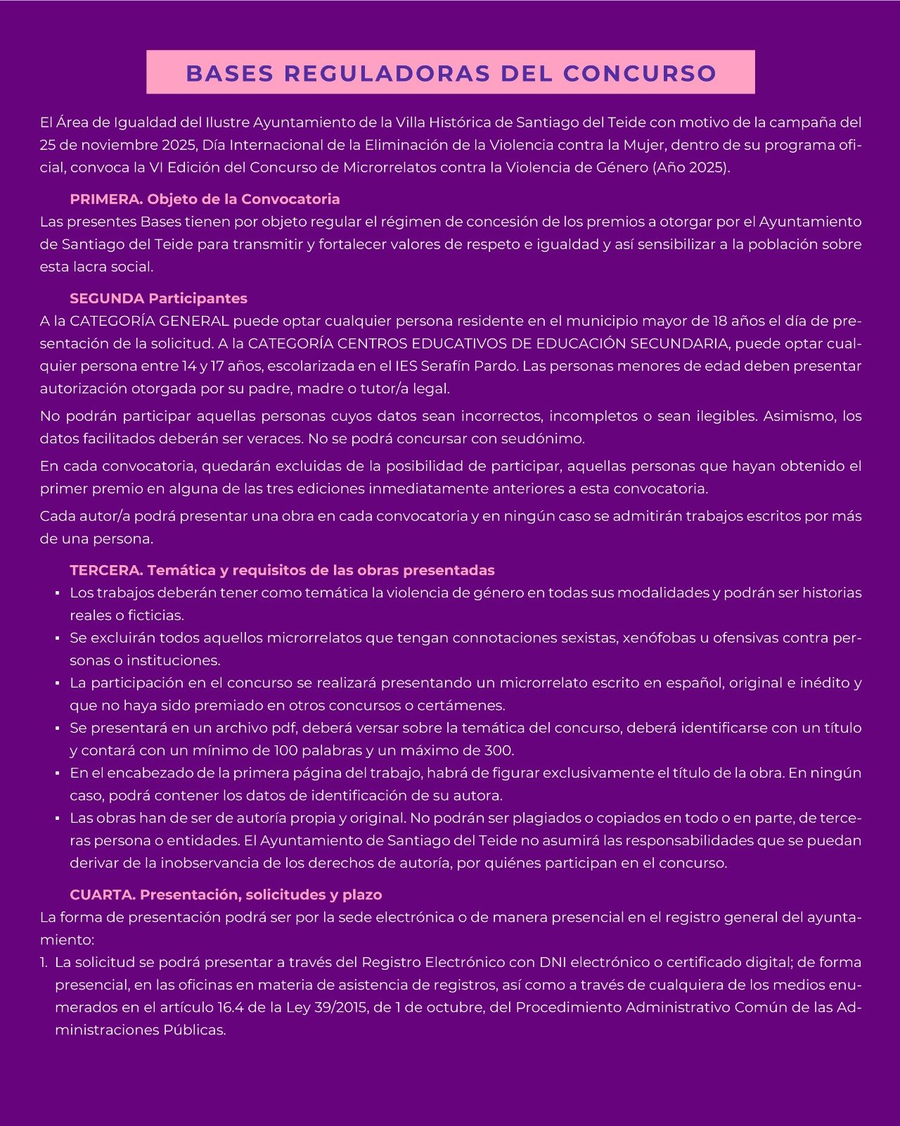 In the general category, any resident of Santiago del Teide over 18 years of age on the day of application submission may participate, while in the other category, Secondary Schools, any student between 14 and 17 years of age enrolled at IES Serafín Pardo may participate (minors must present authorization granted by their father, mother, and/or guardian). The micro-stories, for which the submission deadline is November 28th at 11:59 PM, must address the theme of gender violence in all its forms and may be real or fictional stories; however, any stories with sexist, xenophobic, or offensive connotations against individuals or institutions will be excluded. The following criteria will be used to evaluate the micro-stories: Relevance to the contest theme (2 points), literary and expressive quality (2 points), syntax and spelling (2 points), and originality and coherence of the text (4 points). points).