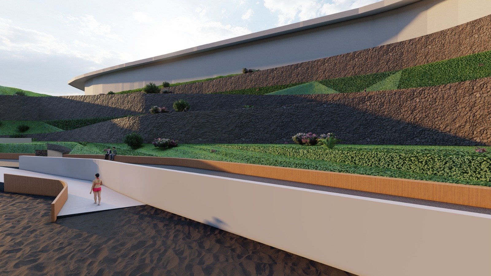 In Phase 2, the suspended sewer network on the natural slope will be upgraded and/or replaced, integrating it with the natural environment. A walkway will be installed above the sewer network, and the beach will be connected to the Los Chochos pool and its surroundings.