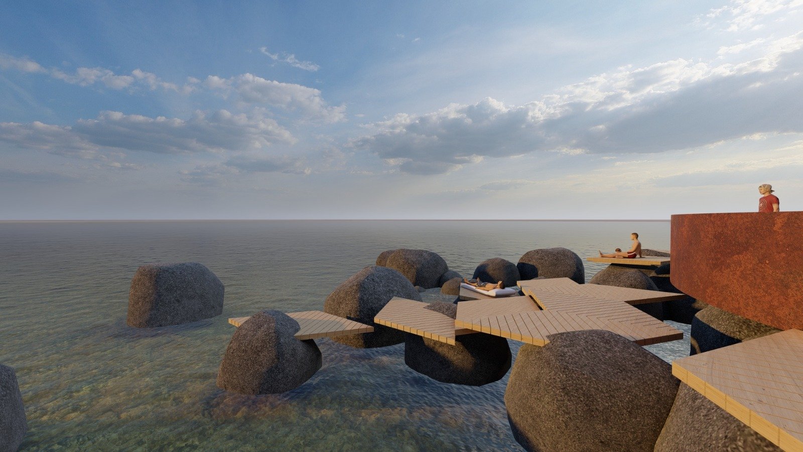 In Phase 3, the access road to the natural pool entrance will be improved, and sunbathing areas will be created using easily removable materials and elements.