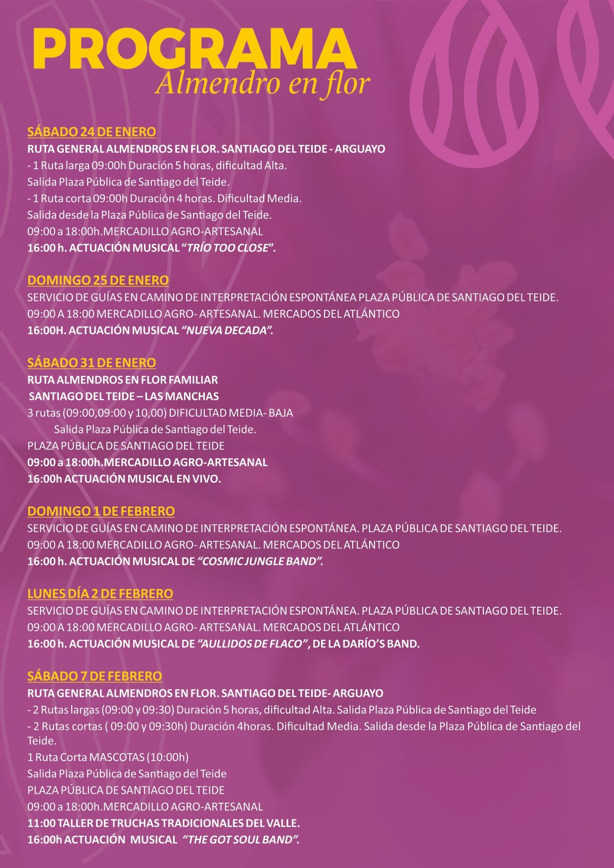 Emilio Navarro stated that "we have the privilege of enjoying and being the epicenter of one of nature's most beautiful ephemeral spectacles on the island of Tenerife: the almond blossom. This year, as in previous years, we are preparing to welcome thousands of visitors from Tenerife, for whom, in addition to various routes, we have planned days full of music, markets, gastronomic tours, and more."