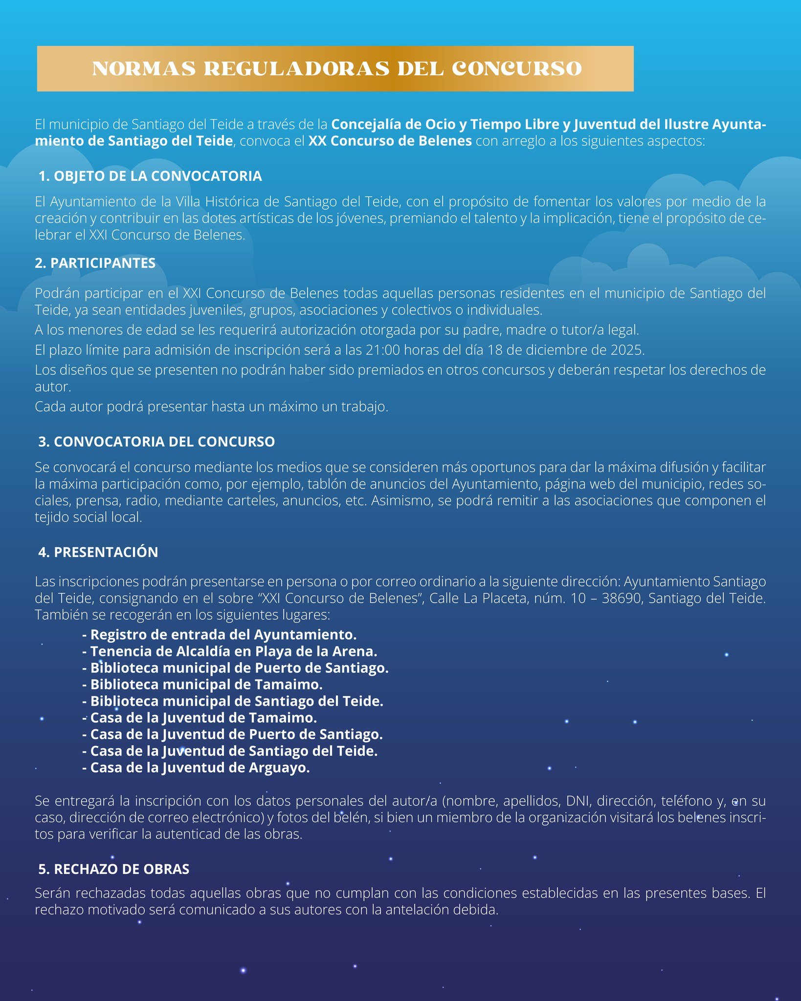 The Santiago del Teide Town Hall is holding the 20th annual Nativity Scene Contest, open to residents of the municipality, including youth groups, associations, and individuals. Participants must have parental or legal guardian authorization.