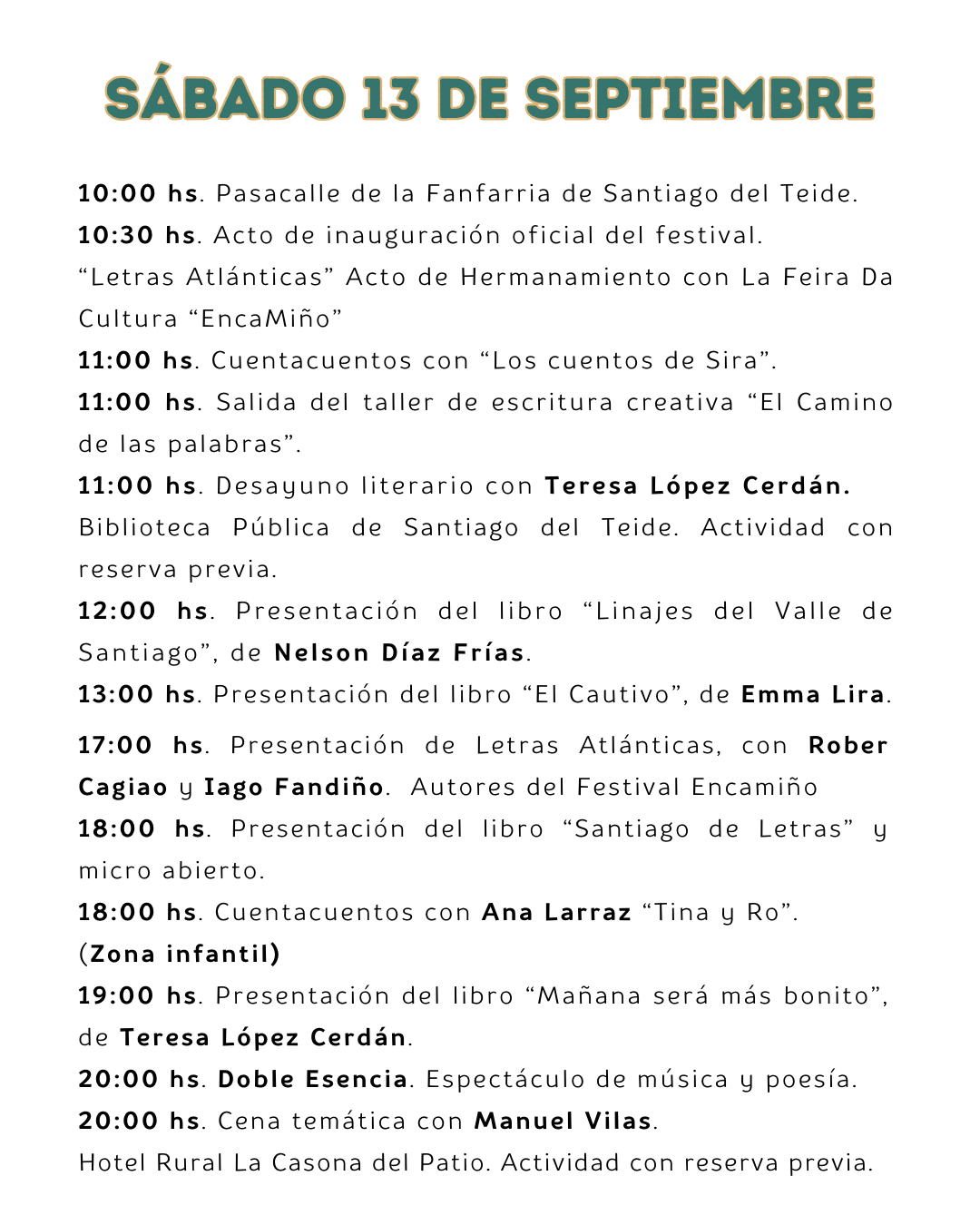 The Santiago de Letras Festival is now ready for its first edition, which will be held on September 12, 13, and 14, 2025, in Santiago del Teide. With a diverse, intense, and vibrant program, the festival will transform our municipality into a true literary oasis, bringing together prominent names in Spanish fiction, local authors, poets, readers, and lovers of the word.