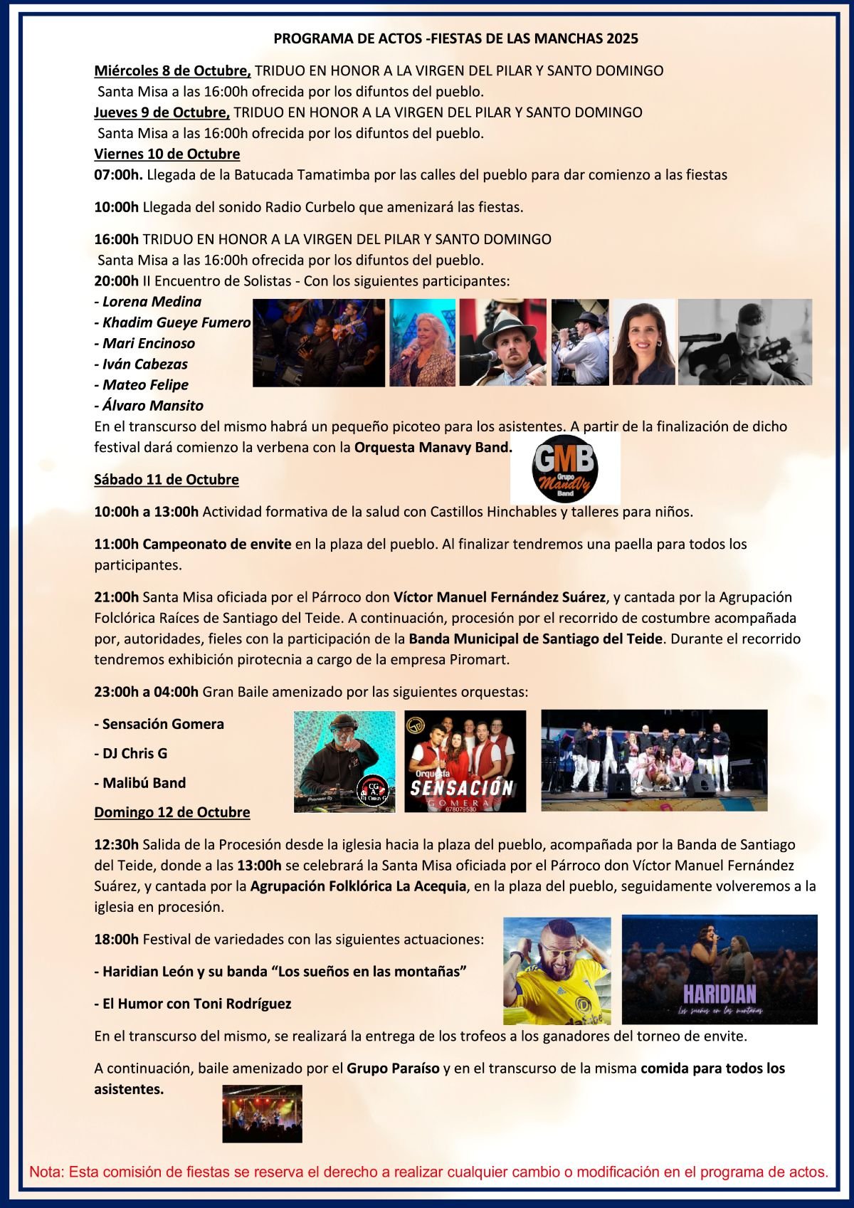 highlight on the municipal festive calendar that will take place from October 10th to 12th and will combine religious, cultural, and recreational events for all audiences. The festivities will begin on October 8th and 9th, when the Triduum in Honor of Our Lady of Pilar and Saint Dominic de Guzmán will be held, witha Holy Mass at 4:00 PM in honor of the town's deceased. On Friday, October 10, the Tamatimba batucada will parade through the town's streets at 7:00 AM, marking the official start of the celebrations. During the day, the Triduum will also be held in honor of the Virgin of Pilar and Saint Dominic, and in the evening, starting at 8:00 PM, the 2nd Soloists' Meeting will take place, with the participation of prominent performers and a performance by the Manavy Band Orchestra. On Saturday, October 11th, the program will continue with health training and children's leisure activities, as well as the traditional envite competition in the town square at 11:00 AM. In the evening, at 9:00 PM, Mass will be celebrated, officiated by the parish priest Víctor Manuel Fernández Suárez and sung by the Raíces de Santiago del Teide Folklore Group. This will be followed by a procession along the usual route, which will also include a fireworks display by Piromart. The day will culminate, from 11:00 PM to 4:00 AM, with a grand folk dance, livened up by the Sensación Gomera orchestras, DJ Chris G, and Malibú Band. On Sunday, October 12th, the main day of the festivities, a procession will take place from the church to the town square starting at 12:30 p.m., accompanied by the Santiago del Teide Band. Afterward, a solemn Mass will be celebrated, officiated by the parish priest, Mr. Víctor Fernández Suárez, and sung by the La Acequia Folklore Group. In the afternoon, starting at 6:00 p.m., a variety show will be held, featuring a musical performance by Haridian León and his band "Los sueños en las montañas" (Dreams in the Mountains), comedy by Toni Rodríguez, and the presentation of trophies to the winners of the "Envite" (Sports Tournament). The celebration will conclude with a dance hosted by the Grupo Paraíso and a communal meal for all attendees.