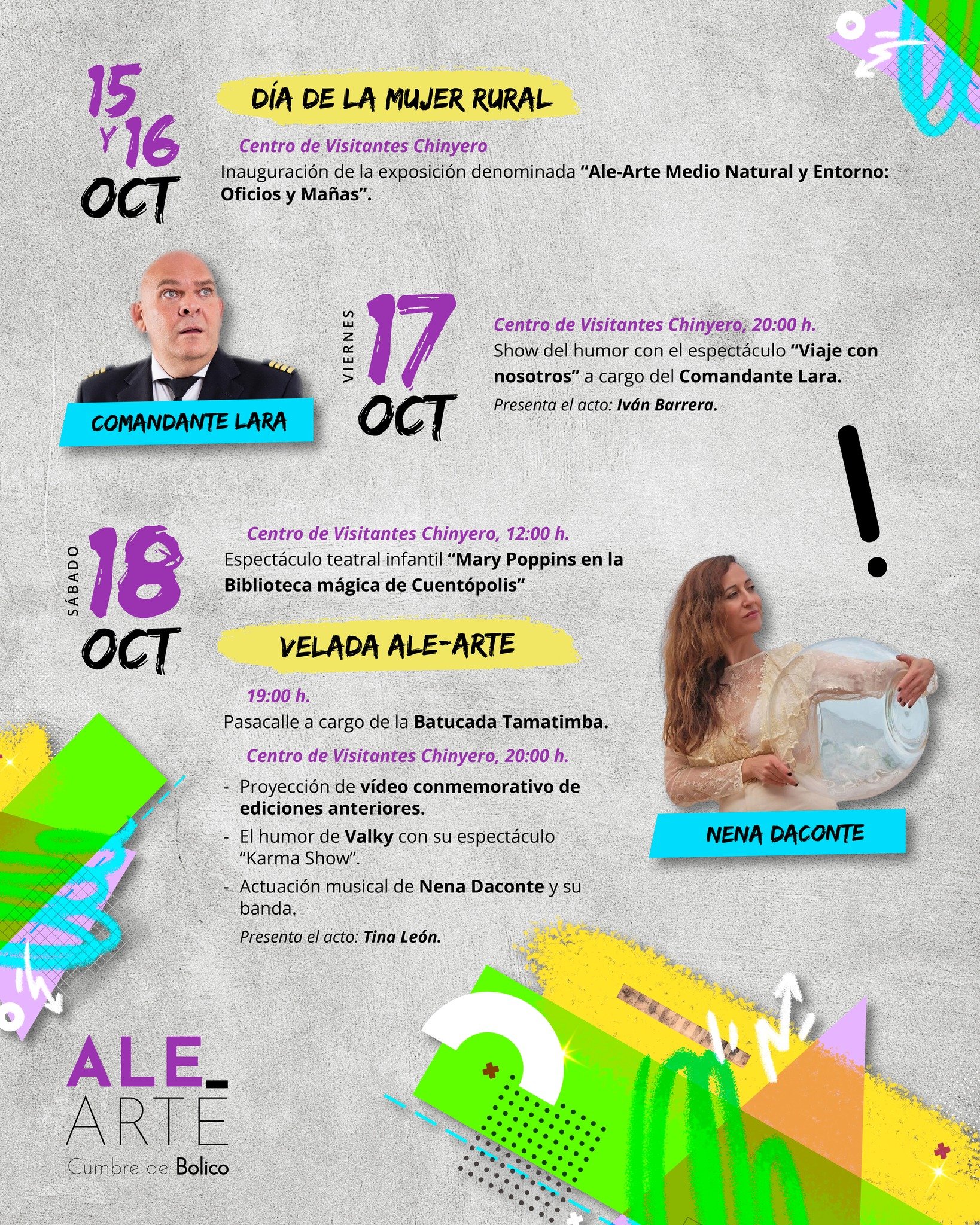 On Saturday, October 18th, at 12:00 PM, the little ones will immerse themselves in a world of magic and literature with the theatrical show "Mary Poppins in the Magic Library of Cuentópolis." The "Ale-Arte Evening" will feature a parade by the Tamatimba Batucada, a screening of a commemorative video from previous editions, and a performance by comedian Valky with his show "Karma Show."