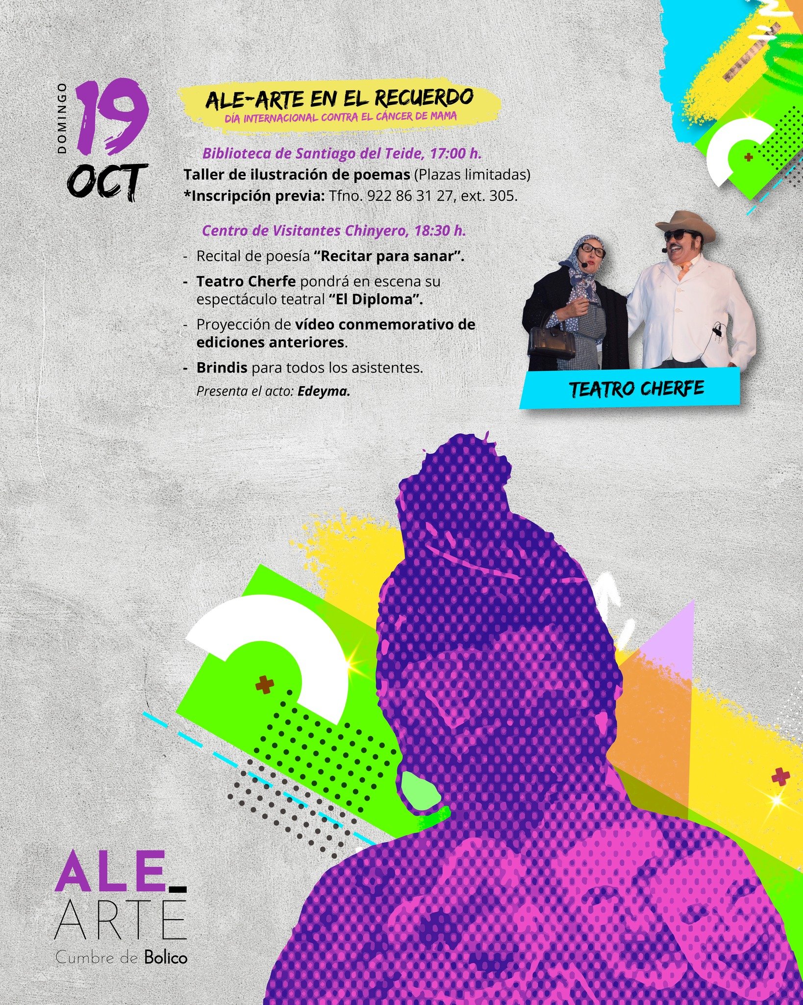 The festival will close on Sunday, October 19th, with the "Ale-Arte in Remembrance" event, coinciding with International Breast Cancer Awareness Day. The program will include a poetry illustration workshop, poetry readings under the theme "Reciting to Heal," the play "The Diploma" by the Teatro Cherfe group, and a final toast to celebrate a decade of shared art in Santiago del Teide.