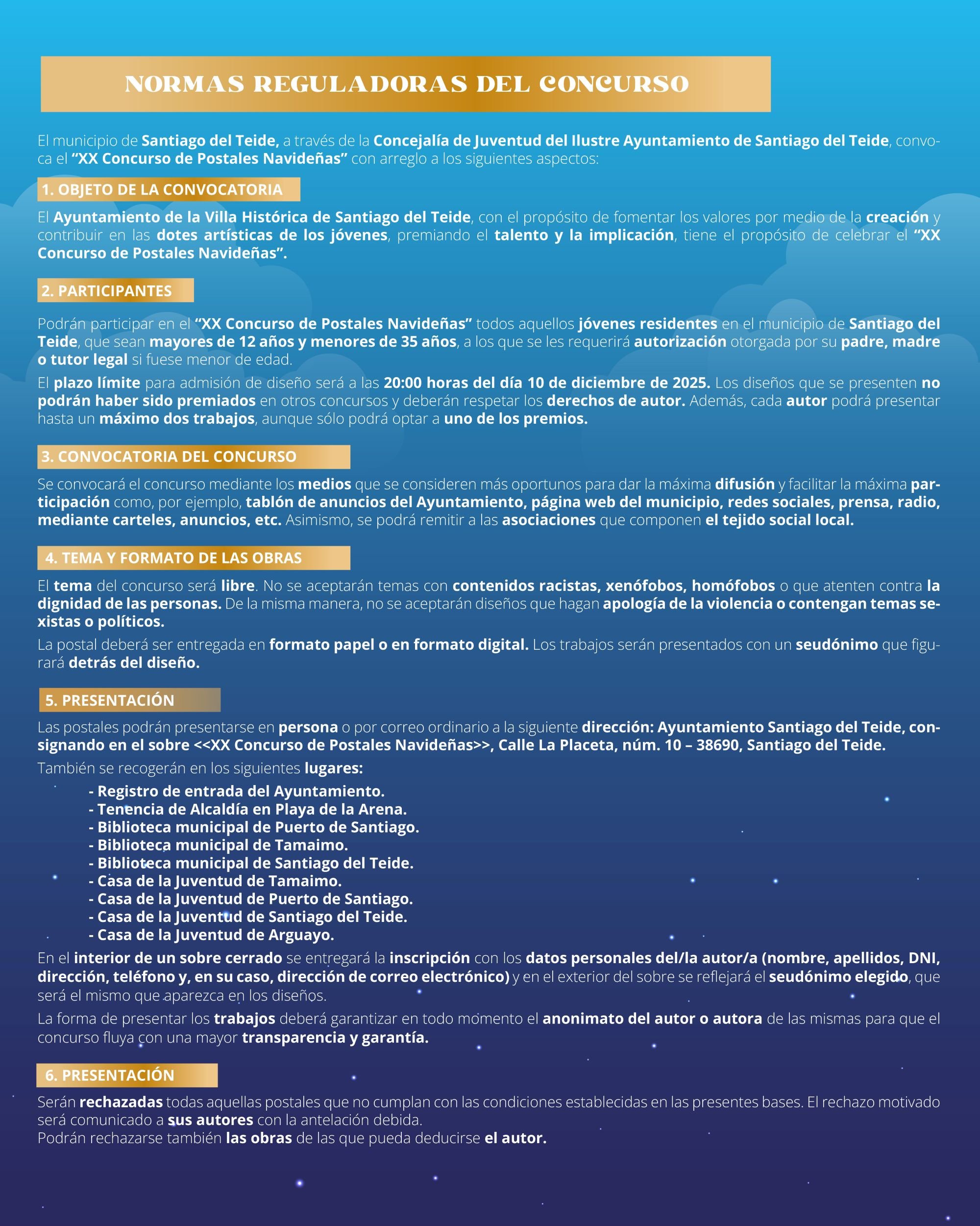 Designs must be submitted in person or by mail to the Town Hall (Calle La Placeta, nº 10 - 38690 - Santiago del Teide). Alternatively, they can be submitted to the Town Hall's registry office, the Playa de La Arena Deputy Mayor's Office, municipal libraries, the Tamaimo and Puerto de Santiago Youth Centers, and various youth centers.