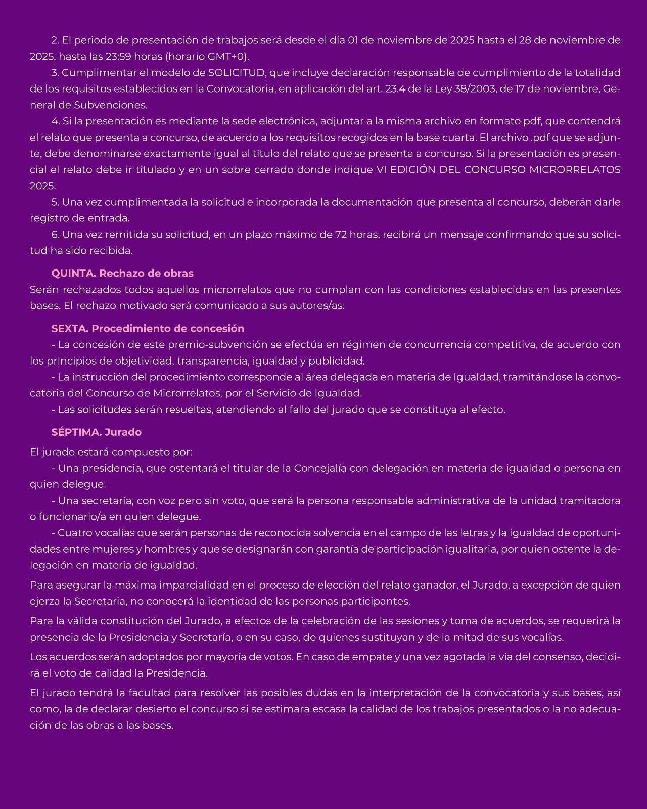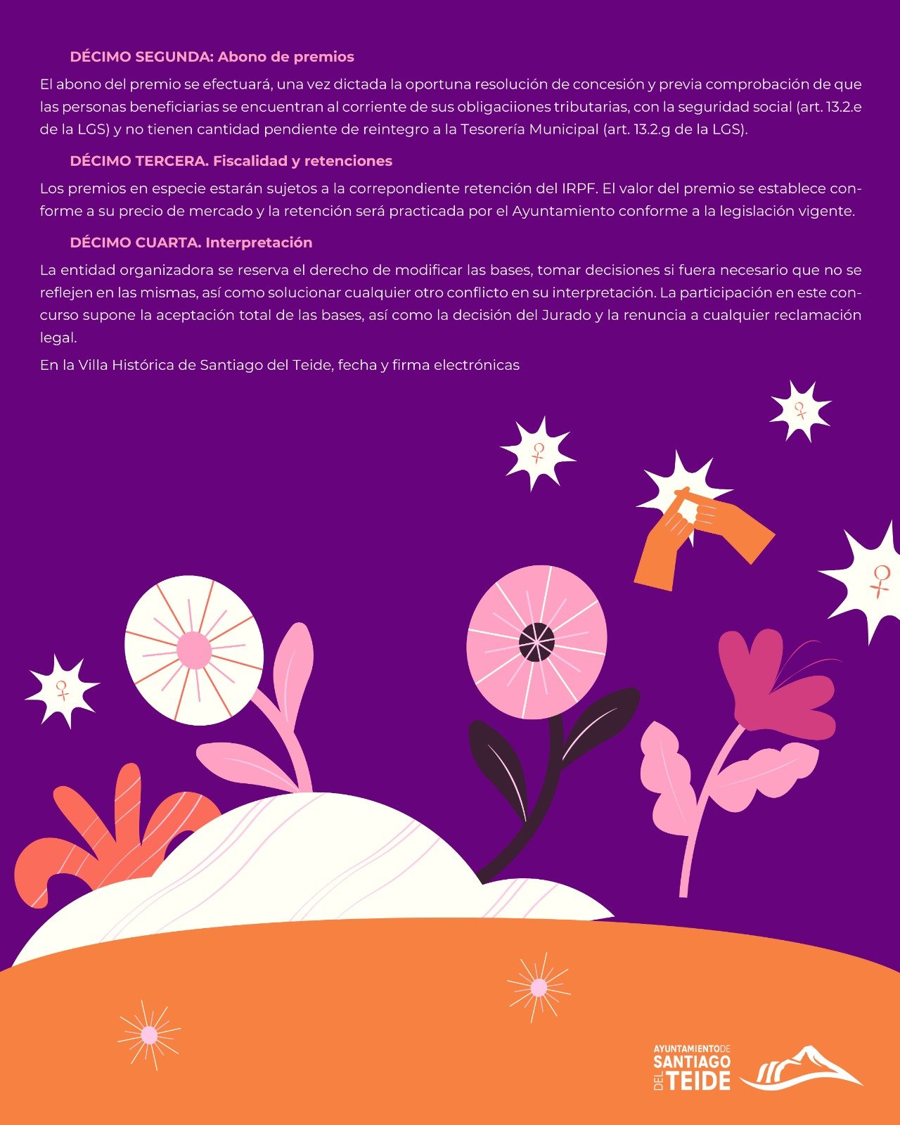In the general category, any resident of Santiago del Teide over 18 years of age on the day of application submission may participate, while in the other category, Secondary Schools, any student between 14 and 17 years of age enrolled at IES Serafín Pardo may participate (minors must present authorization granted by their father, mother, and/or guardian). The micro-stories, for which the submission deadline is November 28th at 11:59 PM, must address the theme of gender violence in all its forms and may be real or fictional stories; however, any stories with sexist, xenophobic, or offensive connotations against individuals or institutions will be excluded. The following criteria will be used to evaluate the micro-stories: Relevance to the contest theme (2 points), literary and expressive quality (2 points), syntax and spelling (2 points), and originality and coherence of the text (4 points). points).