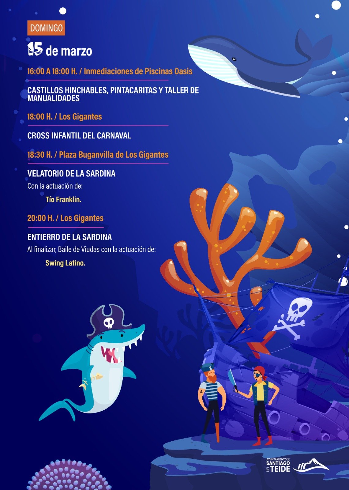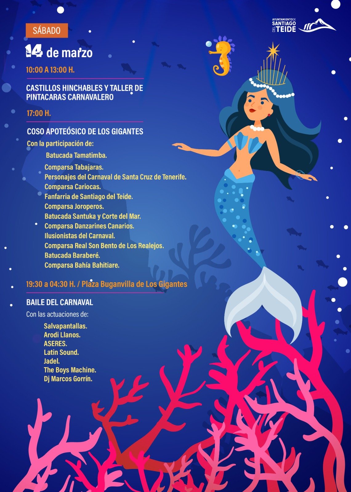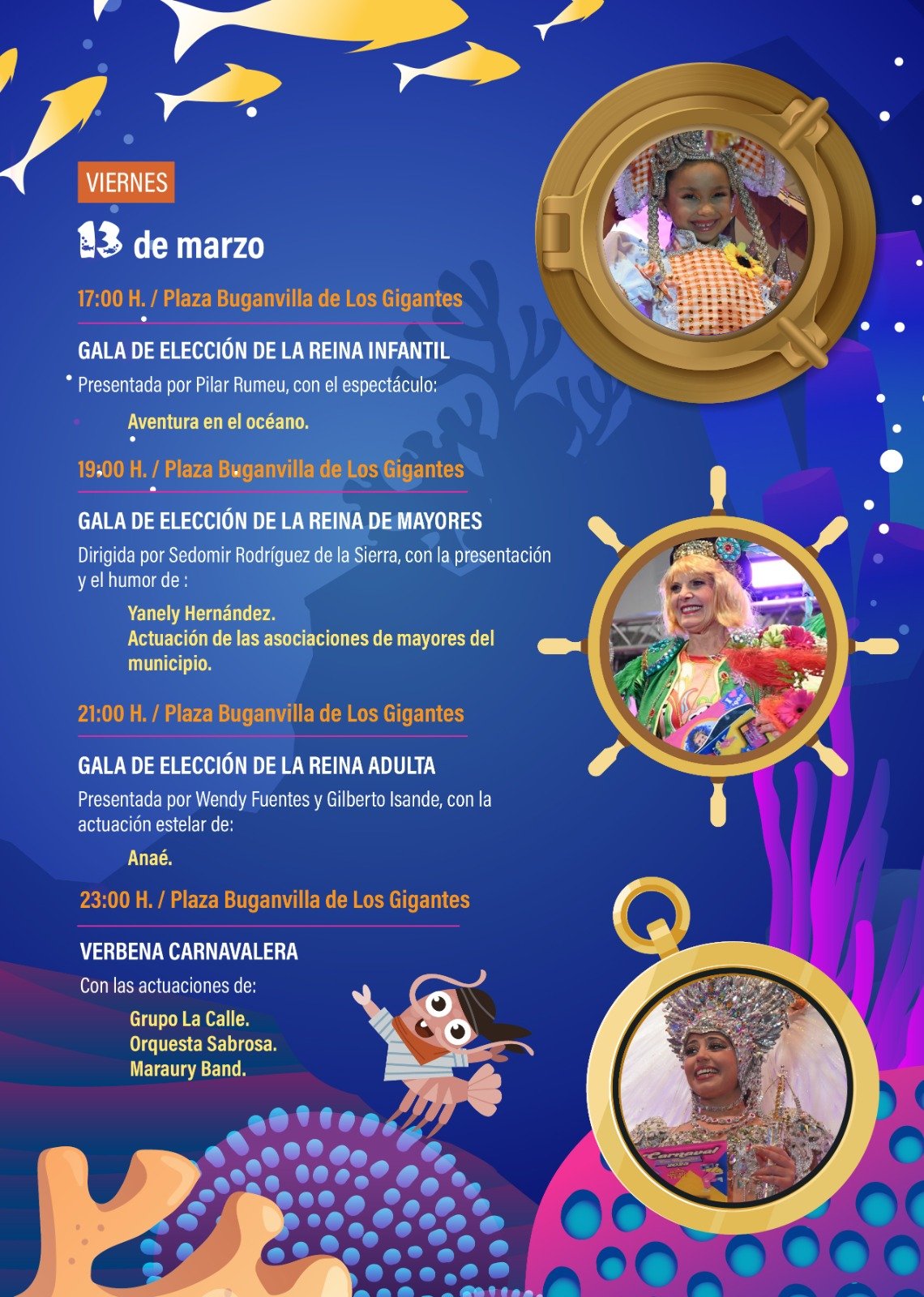 Saturday, March 14th, will be marked by family activities in the morning and the afternoon with the grand Carnival Parade of Los Gigantes, in which different comparsas, batucadas, and groups from the Santa Cruz de Tenerife carnival will participate. The day will culminate with a grand night of dancing and musical performances.
